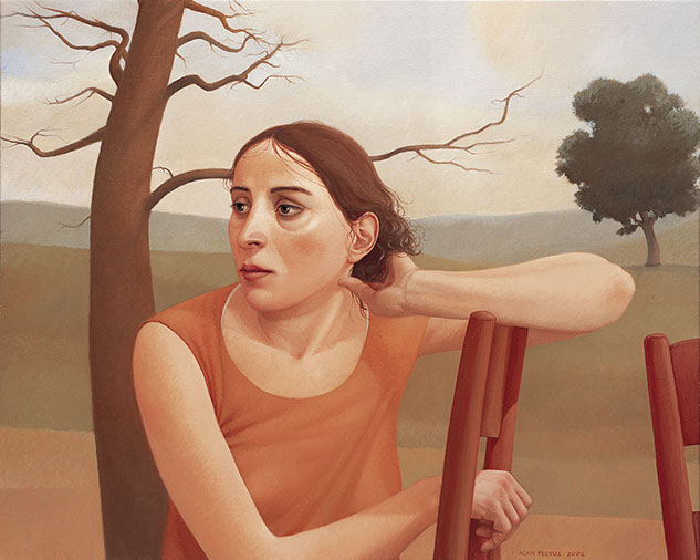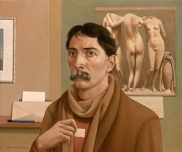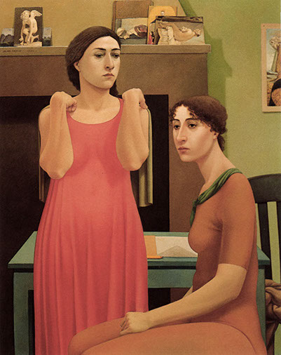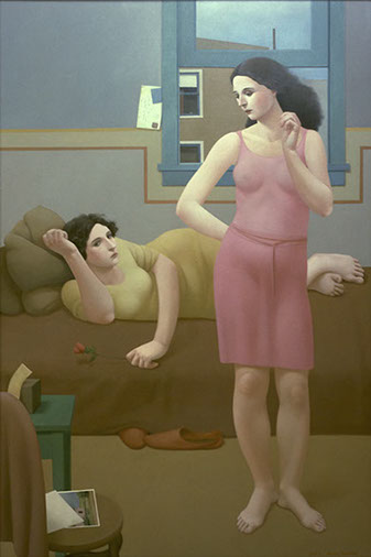 [...] Painting without models posing for me was a choice I made early on. I wouldn't have wanted my paintings to look like paintings of models in the way, for example, Philip Pearlstein's paintings do. Of course that doesn't have to be the case when painting from the model, and there were other reasons for me to work without a model. As a young painter on a very small teaching salary I couldn't afford to pay models to pose for me and I didn't want to ask friends to pose, but more than that I liked my studio time uncomplicated by the presence of another person. I value the solitude of my painting time. And I want to invent my figures as my paintings evolve. Finding the form of a figure is far more difficult without having a model to refer to than being able to look at a model.