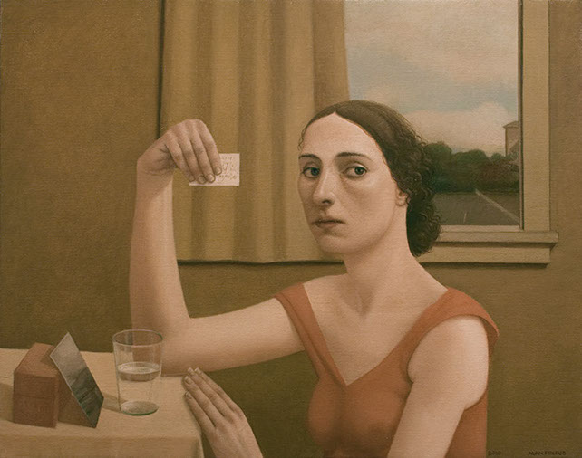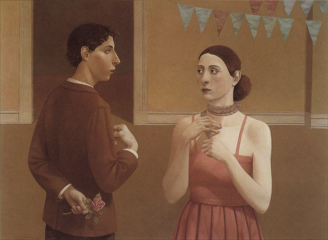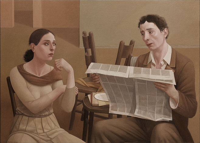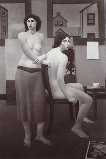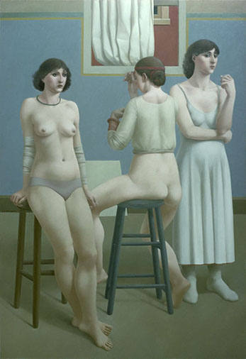 [...] My larger paintings take months to complete and go through a thousand small changes in addition to several quite big changes. A figure can disappear, or a figure can appear that wasn't there to begin with. A head turns, eyes shift in the direction of their gaze, an arm shifts, a book or a cup on a table will move. The table moves. A nude gets dressed or a dressed figure sheds her clothing. A chair turns to face the other direction. A wall moves back and a shadow divides it diagonally. Its color changes. A window becomes a landscape painting, or it is painted out.