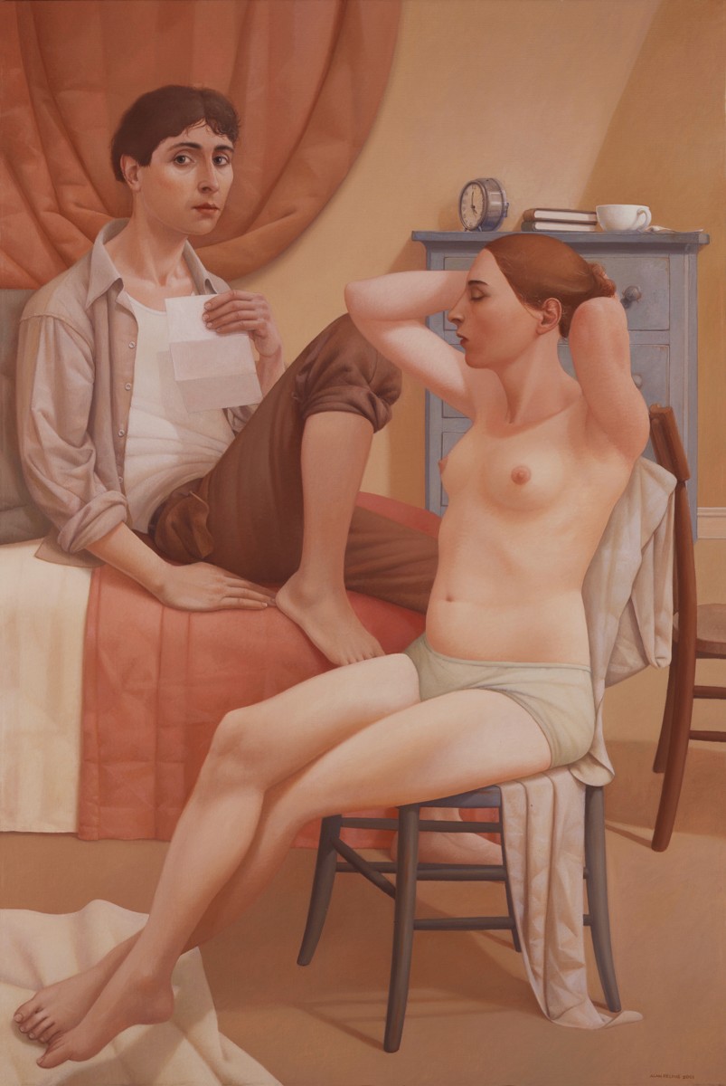 In Feltus's Time Together (2001), the almost naked muse sits on a simple chair. Her arms are raised as if to arrange her hair. Her legs are crossed; her feet do not touch the ground but hover, somewhat mysteriously, casting a shadow on the rumpled white material below them. She gazes out of frame, acknowledging neither the viewer nor her companion. Her profile has a classical simplicity, as if she were a maiden escaped from a Grecian urn or a Renaissance marriage portrait. The young man who sits behind her on a low bed has one leg drawn up; he holds a letter, blank side out, to his chest. The blank letter, a recurring motif, is an economical way of alluding to a breakdown in communications, or perhaps the inaccessibility of personality in even the most intimate relationships. What the relationship is between these people and what the emotional temperature in the room at this particular moment maybe remain tantalizingly vague. Yet the play of shapes has its own logic. The room seems so shallow that the man and woman might be figures in a frieze. Her bent elbow overlaps his bent knee. His hand echoes the shape of his bare foot, which visually impinges on her thigh. The compositional compacting of body parts communicates intimacy, yet there is palpable emotional distance between these characters.